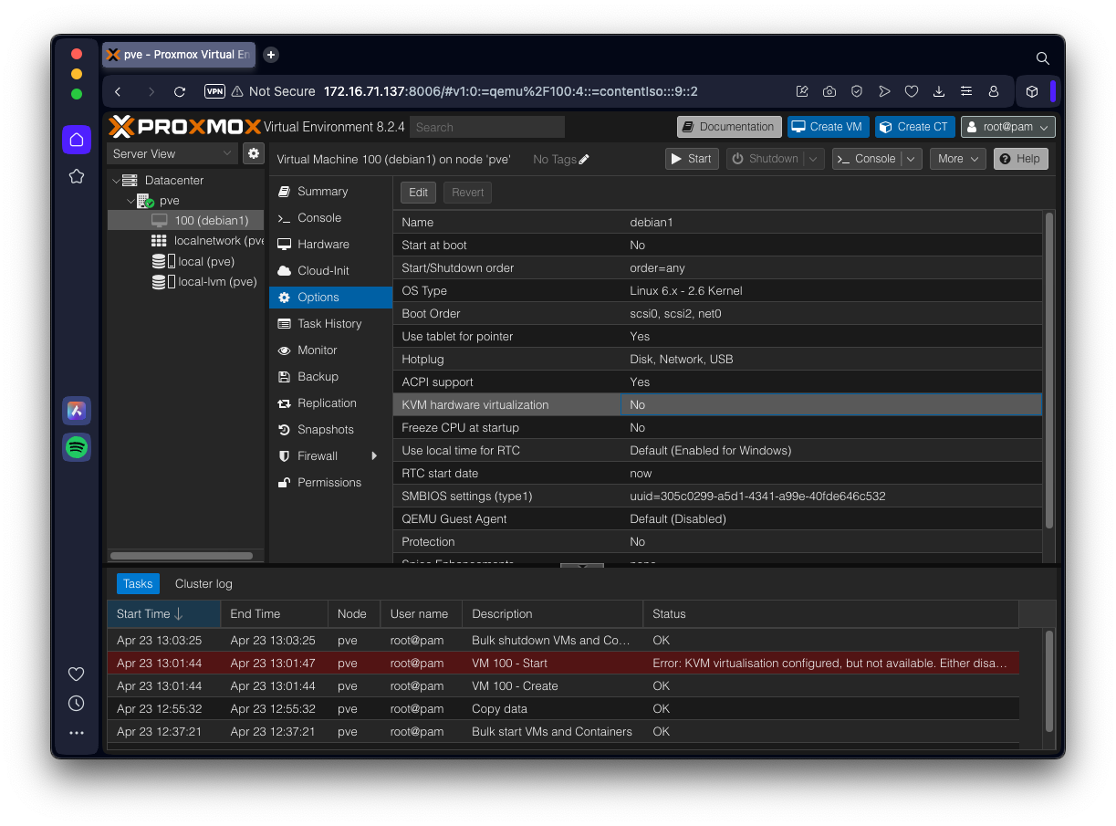 On the right side, double-click "KVM Hardware Virtualization" and disable it, as shown below.