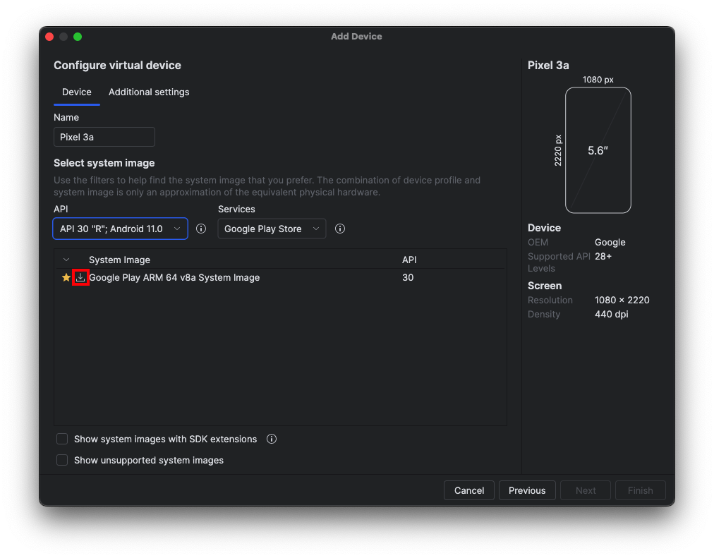 In the "Configure virtual devide" screen, select an API of "API 30 :R:, Android 11.0", as shown below.