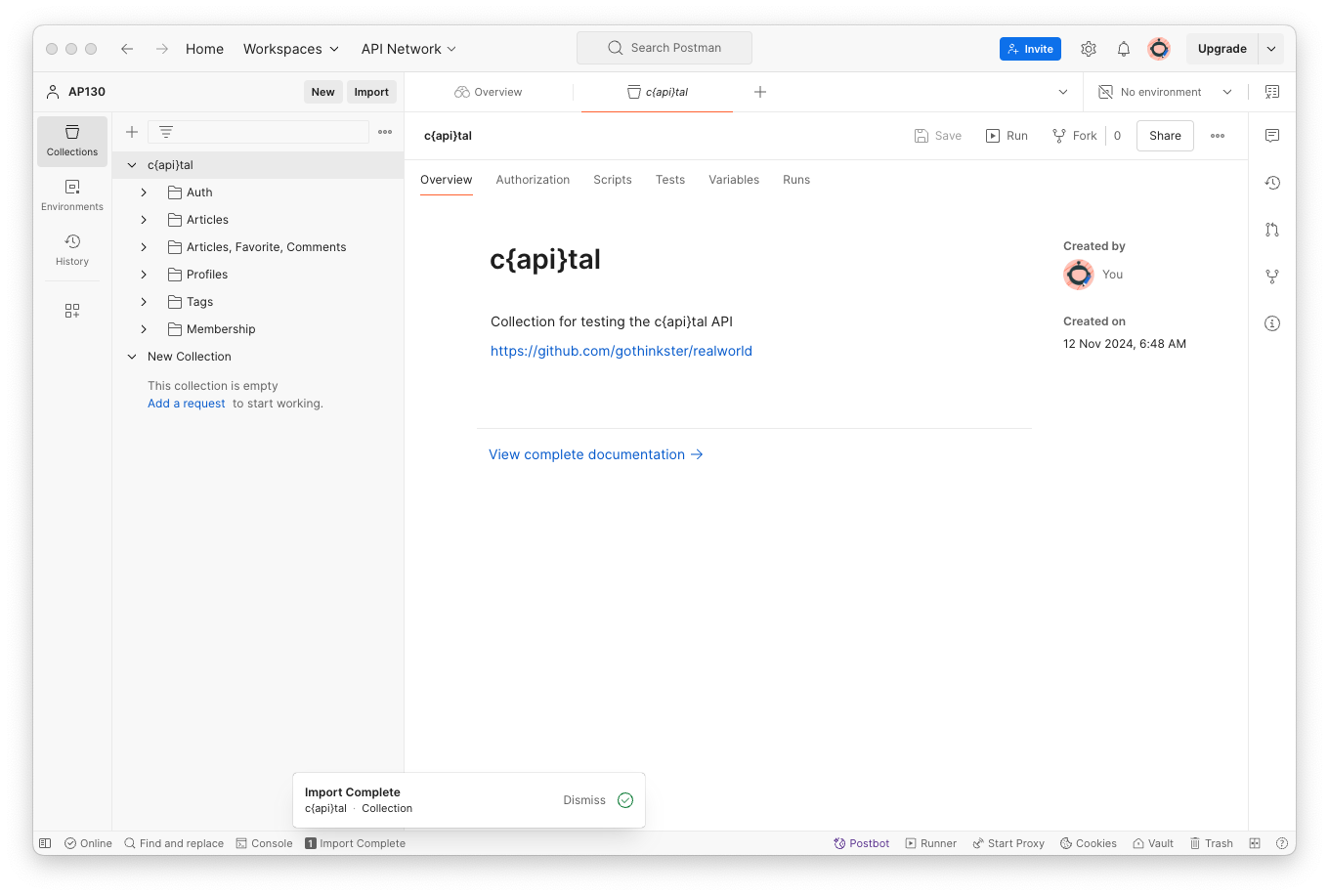 In Postman, in the c{api}tal container, expand the "Articles, Favorites, Comments" container and click "Delete Comments for Article".