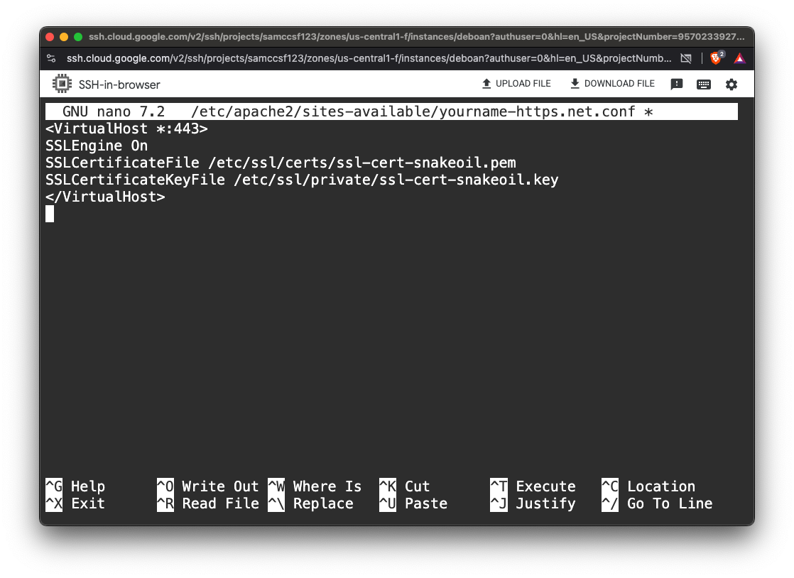 Enter this data, as shown below:sudo a2enmod ssl sudo nano /etc/apache2/sites-available/yourname-https.net.conf