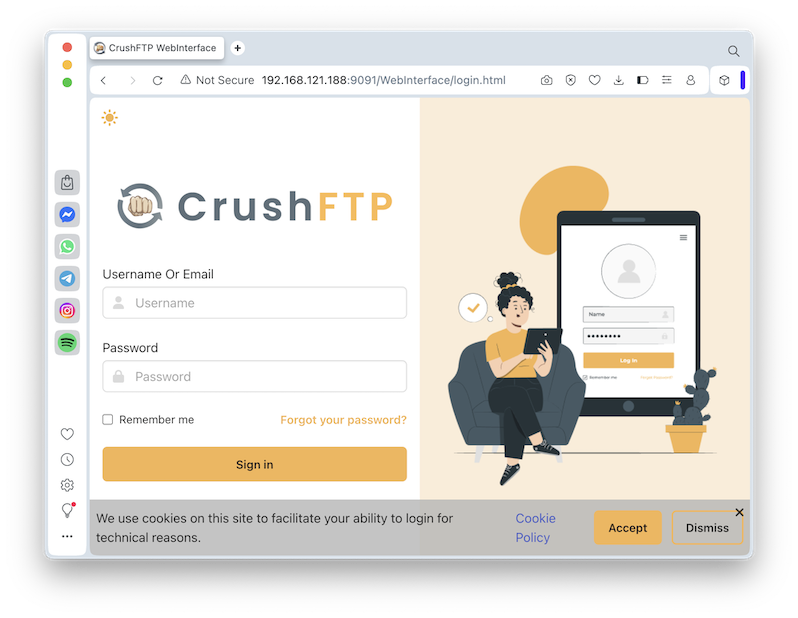 http://192.168.121.188:8081/WebInterface/login.htmlYou see a CrushFTP login page, as shown below.