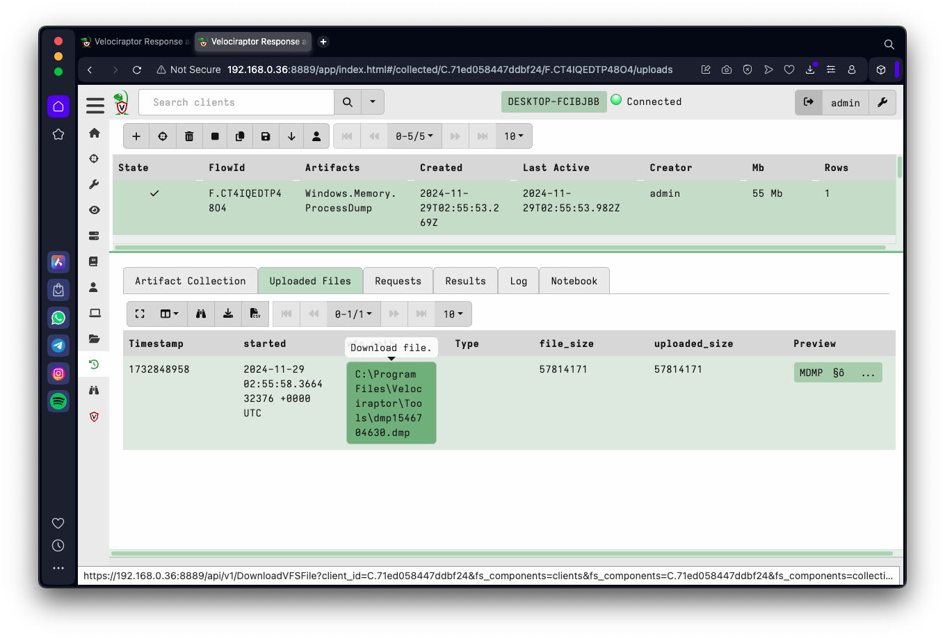 Windows.Memory.ProcessDumpConfigure a ProcessRegex of PUPAcquire the memory of the PUP's process. The acquired memory dump is on the "Uploaded Files" tab, and you can download it to your local system by clicking on the path below the header "vfs_path", as shown below.