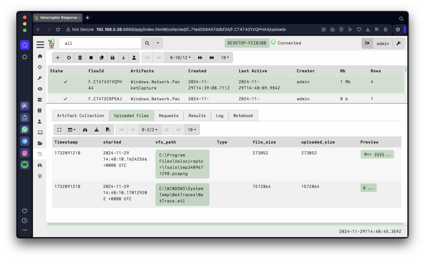 When it finishes, click the "Uploaded Files" tab. A link appears to a .pcapng file, as shown below.