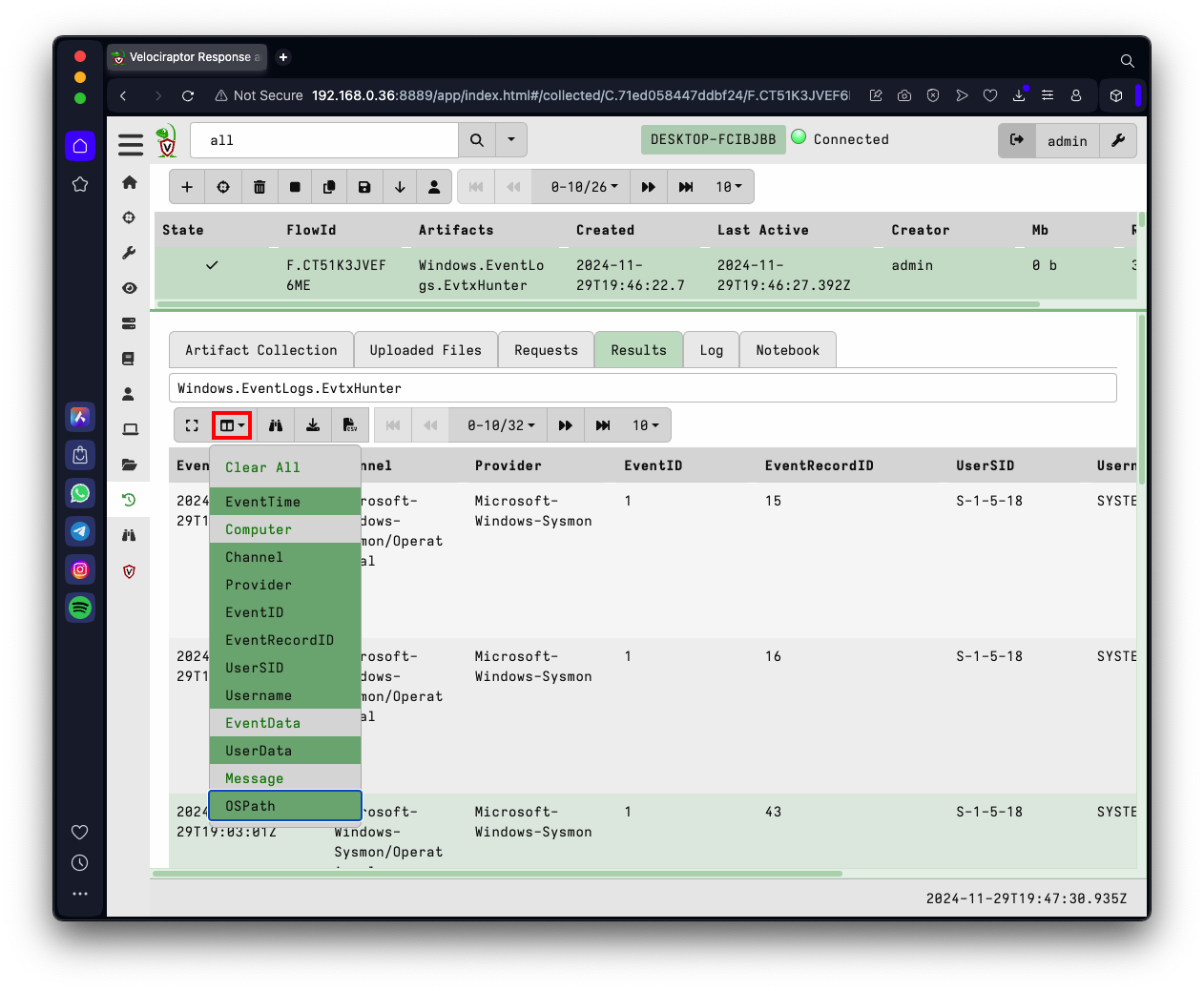 In the Results page, click the "Show/Hide Columns" icon, outlined in red in the image below, and clear the EventData, Message, and OSPath fields, as shown below.