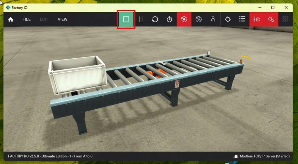 The Scene loads, showing a conveyor belts and a box, as shown below.