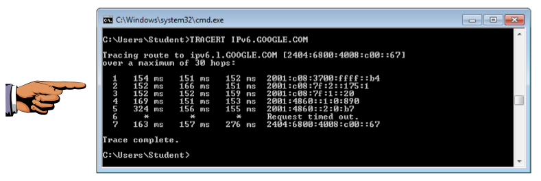 The number of hops may be different, and the address on the endpoint may be different, because Google has many servers, but you should see an IPv6 address on the last hop, as shown above.