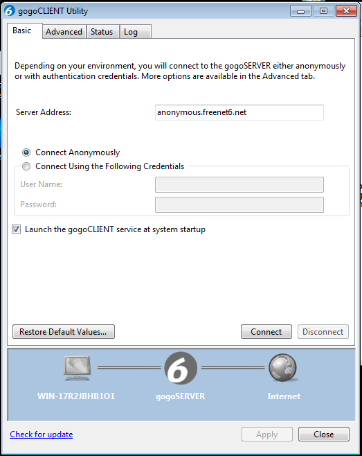 If it won't connect, try changing the server address from anonymous.freenet6.net to one of these: