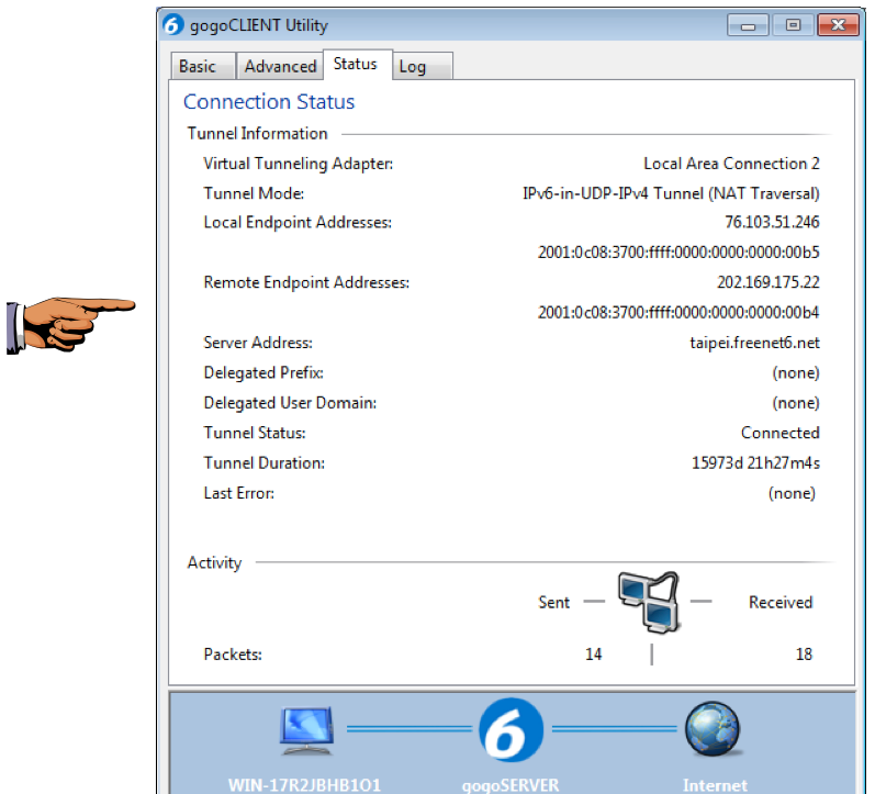 Once you are connected, click the Status tab to show your addresses, as shown below: