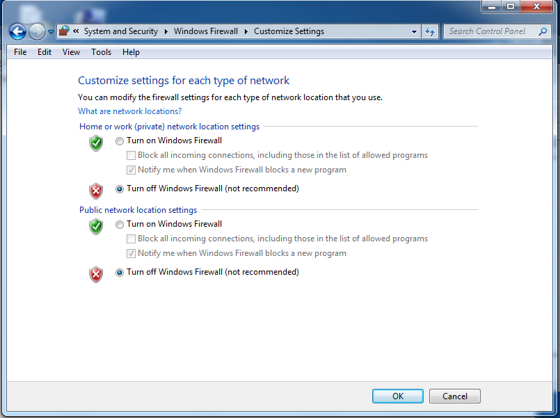 Click both "Turn off Windows Firewall (not recommended)" buttons, as shown below:
