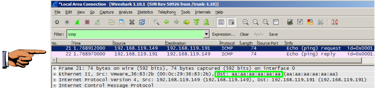 In the middle pane of Wireshark, you should see "Dst: aa:aa:aa:aa:aa:aa", as shown below.
