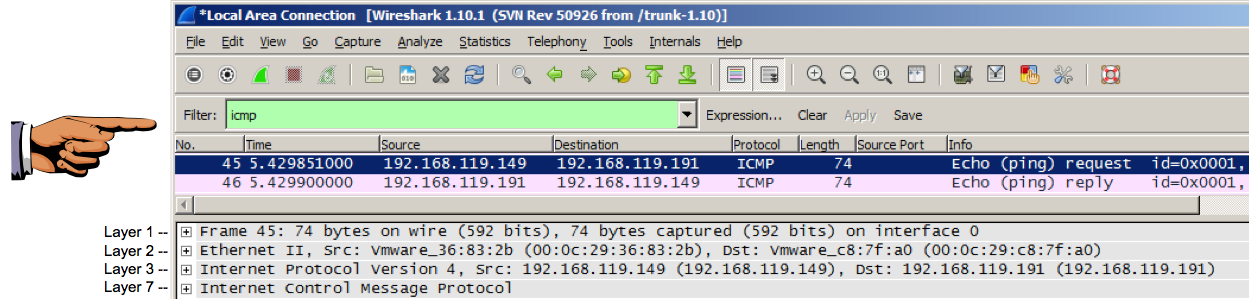 In the middle pane of Wireshark, examine the four sections, labelled by OSI layers in the image below. Make sure you can find these things: