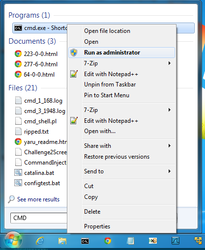 In the Search results, right-click cmd.exe and click "Run as administrator", as shown below: