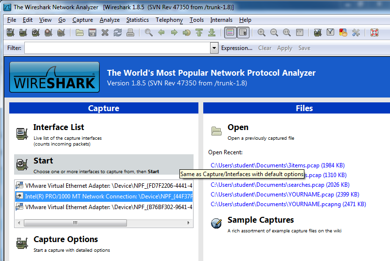 In Wireshark, on the left side, highlight your real network adapter (not a virtual one), as shown below, and click Start.