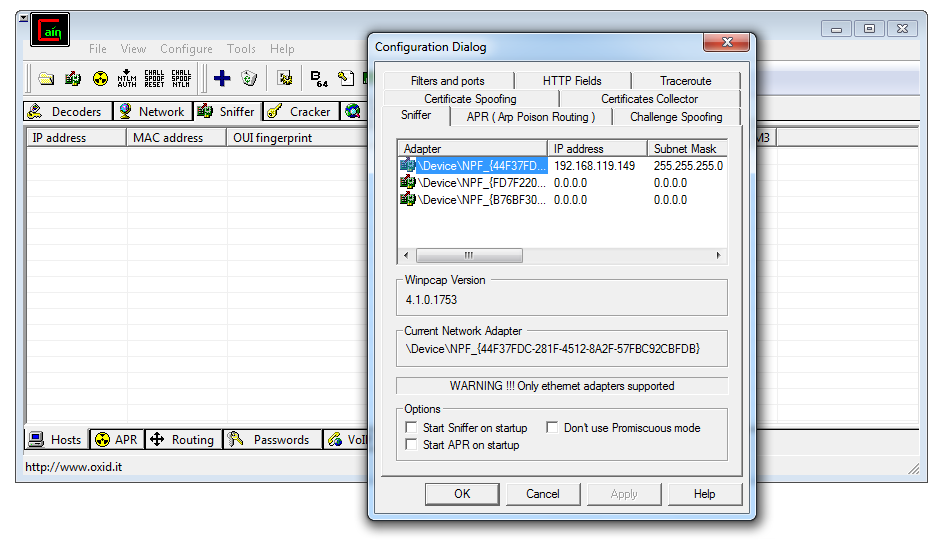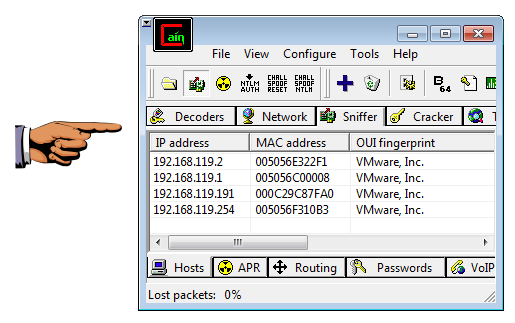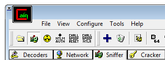 In Cain, in the top center, click the Sniffer tab. From the Cain menu bar, click Configure.