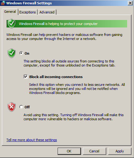 Click both the the On button and the "Block all incoming connections" button, as shown below: