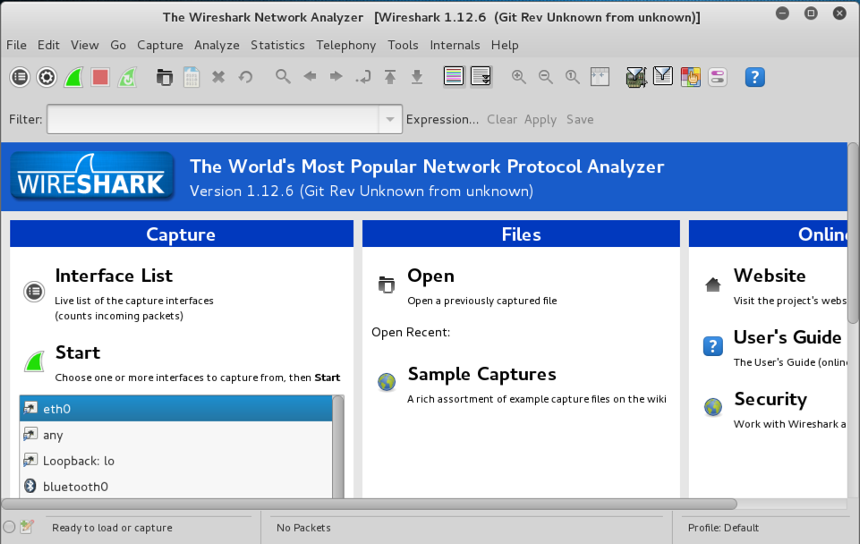 In the lower left of the Wireshark window, under the Start button, click eth0 to highlight it, as shown below.