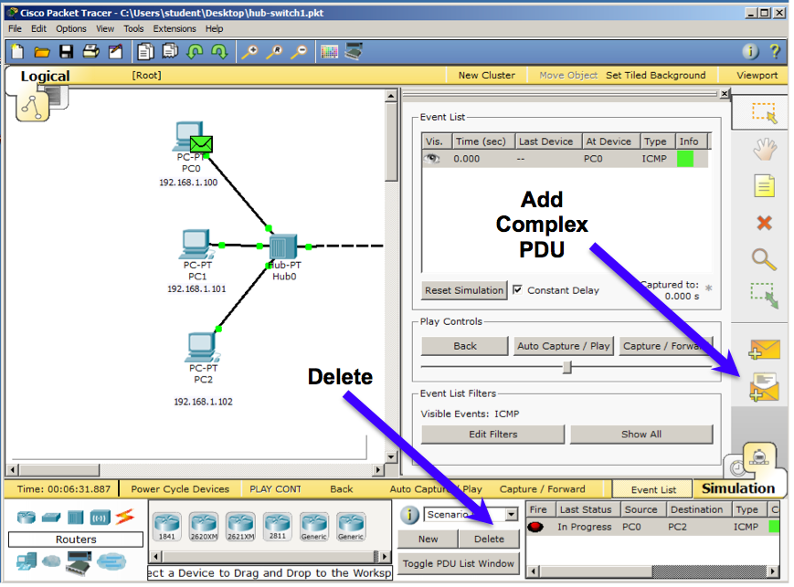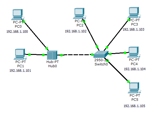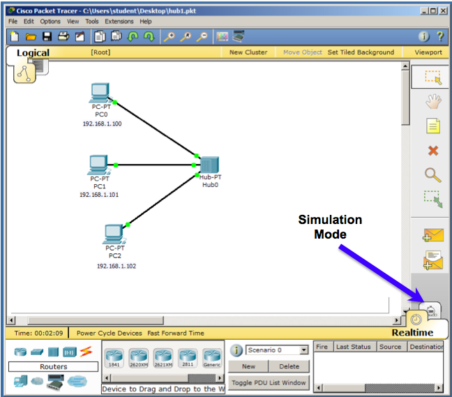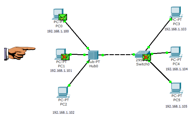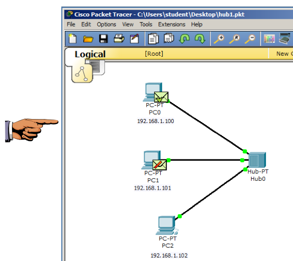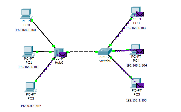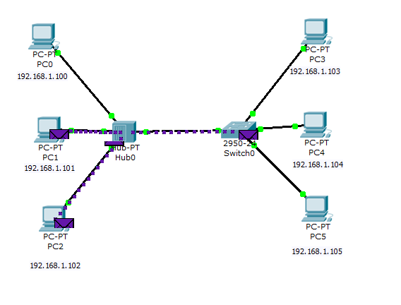 Watch the simulation. First the hub sends packets to PC1, PC2, and Switch0, as shown below: