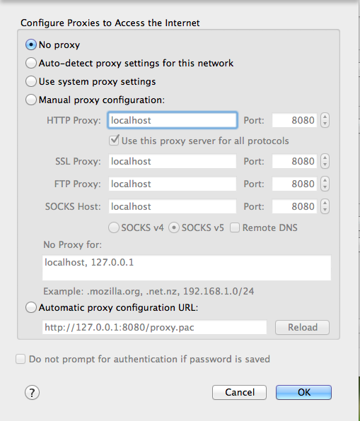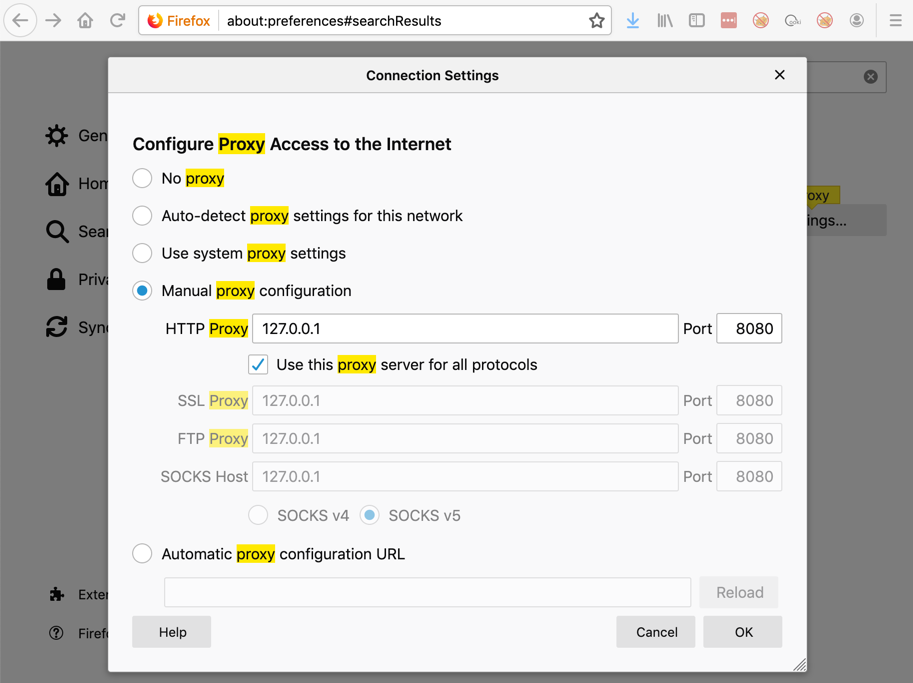 Click the "Manual proxy configuration" button and enter an HTTP Proxy address of 127.0.0.1 and a Port of 8080