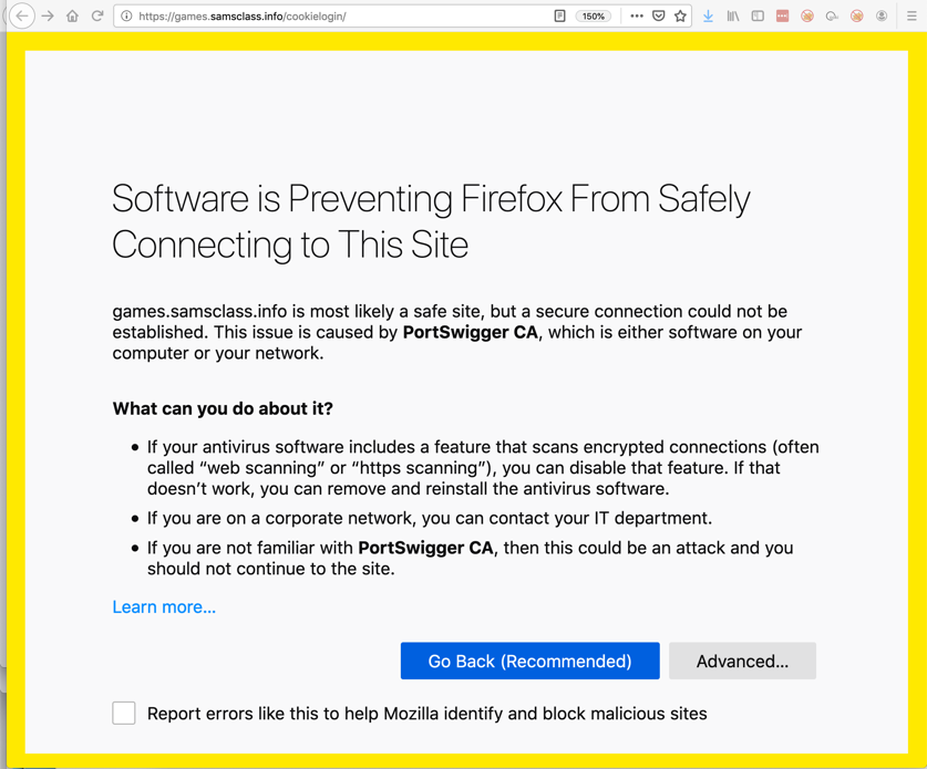 A certificate warning appears, as shown below, saying that the certificate came from "Portswigger", the makers of Burp, instead of a trusted Certificate Authority.