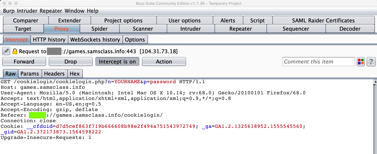 In Burp, you want to capture the Burp shows the Web request shown below. If you see a different request, such as a "Detect Portal" request, click the Forward button. You may have to forward through several requests to get to the correct request.