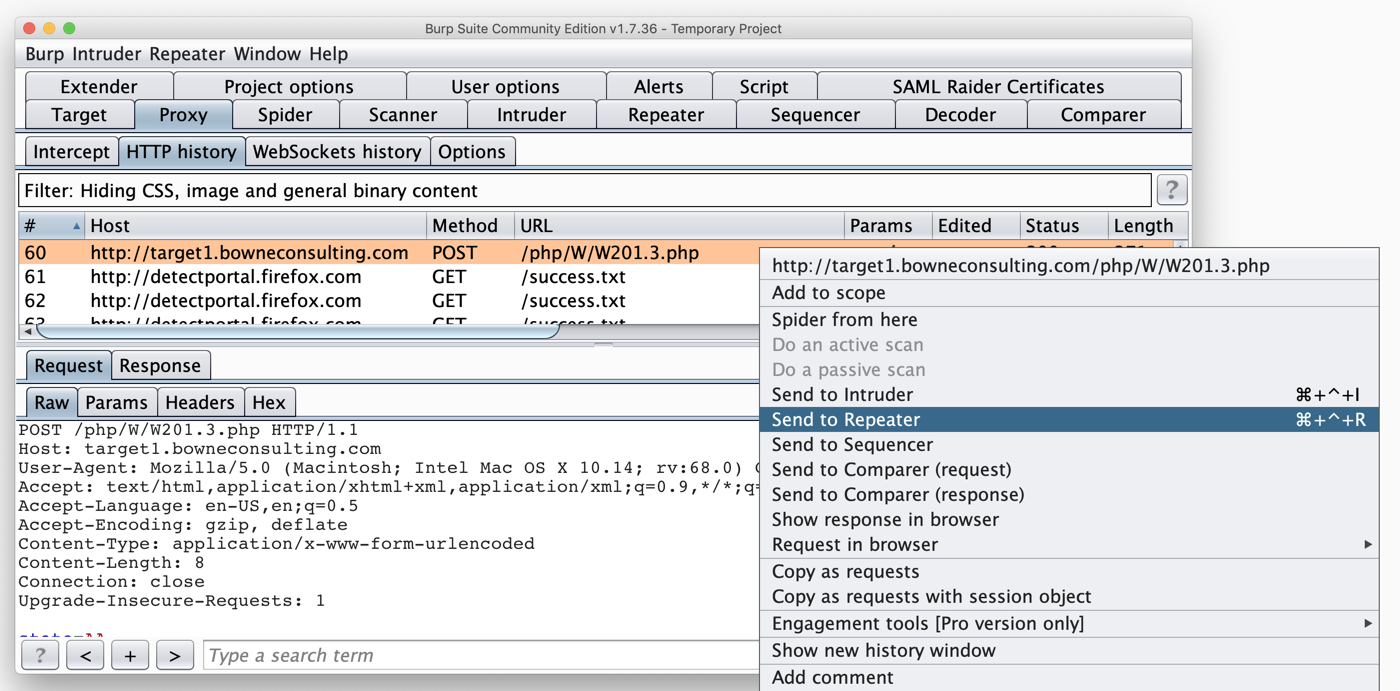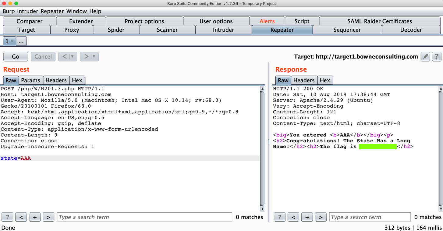 Turn off Intercept in Burp and submit a State value. Find your request in HTTP History. As shown below, right-click the request and click "Send to Repeater".