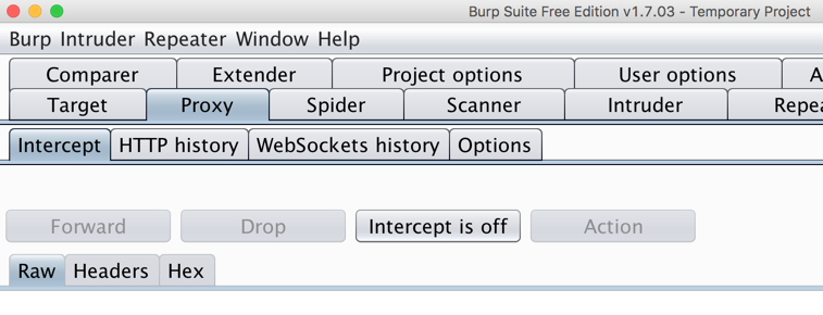 In Burp, click the Proxy tab. Click the Intercept button. If the button label reads "Intercept is on", click it to make it show "Intercept is off", as shown below.