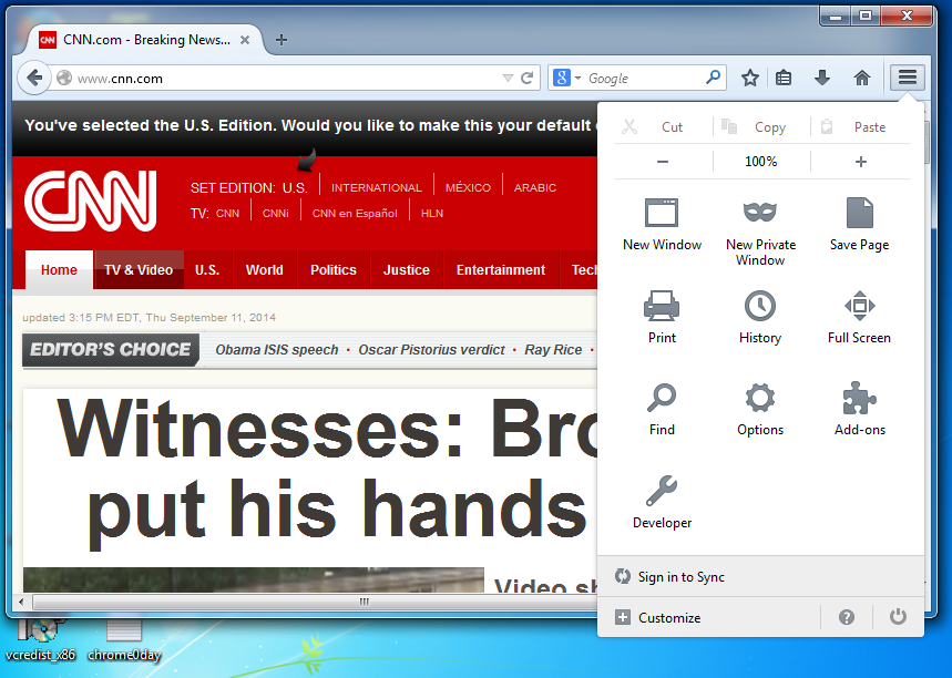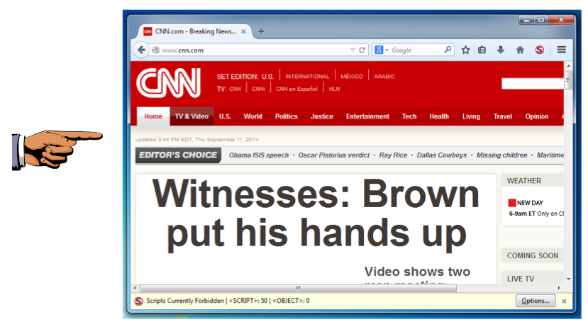 The CNN Web page opens. Some of the advertisements may now show empty boxes. A message appears at the bottom of the window saying "Scripts Currently Forbidden" as shown below.