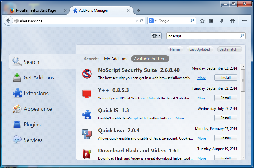 In the "Add-ons Manager" tab, box, in the "Search all ad-ons" box, type noscript. Press Enter.