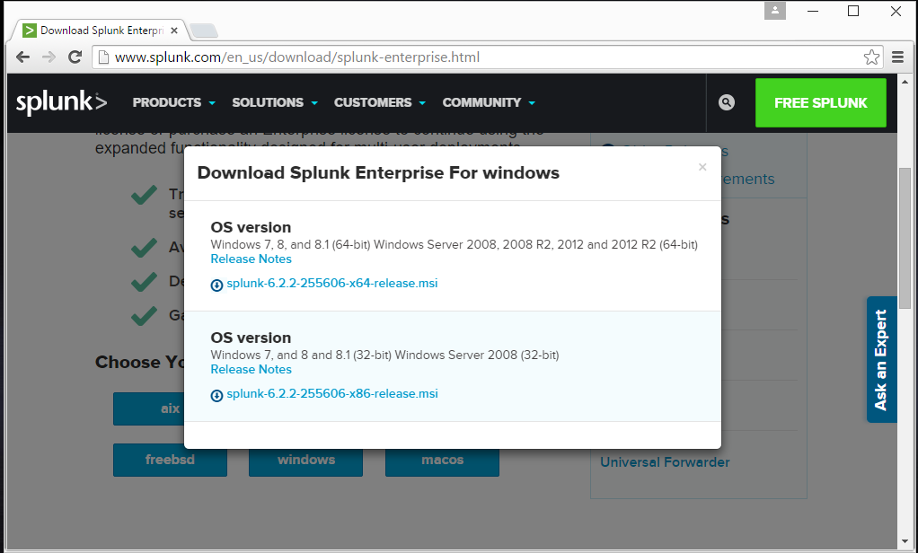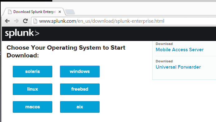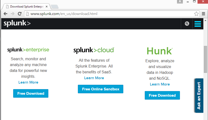 In the "splunk>enterprise" section, click the "Free Download" button, as shown below.