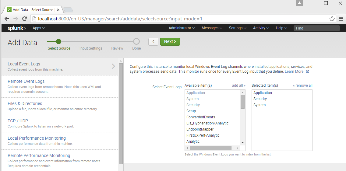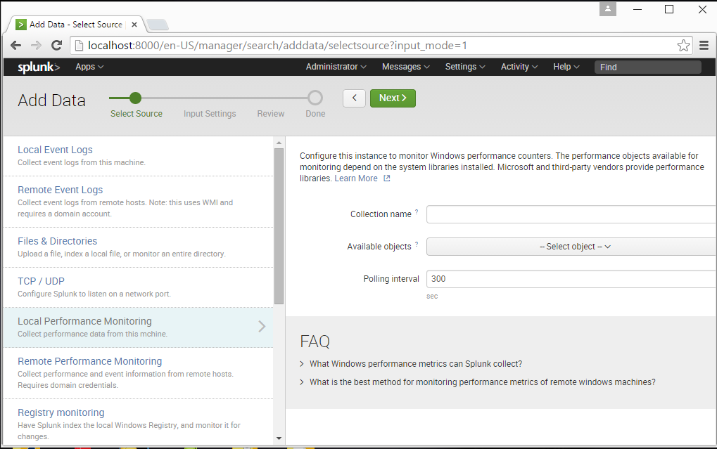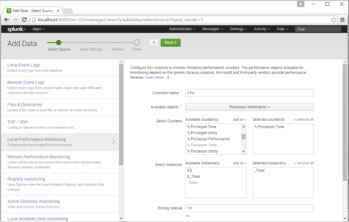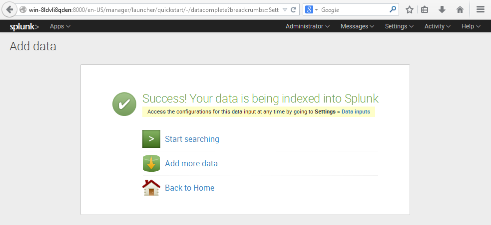 A page appears saying "Local performance monitoring input has been created successfully", as shown below.