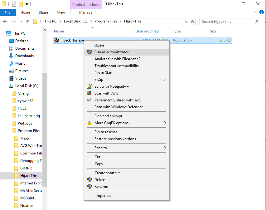In the right pane, right-click HijackThis.exe and click "Run as Administrator", as shown below.