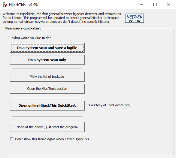 The main HijackThis box appears, as shown below. Click the "Do a system scan and save a logfile" button.
