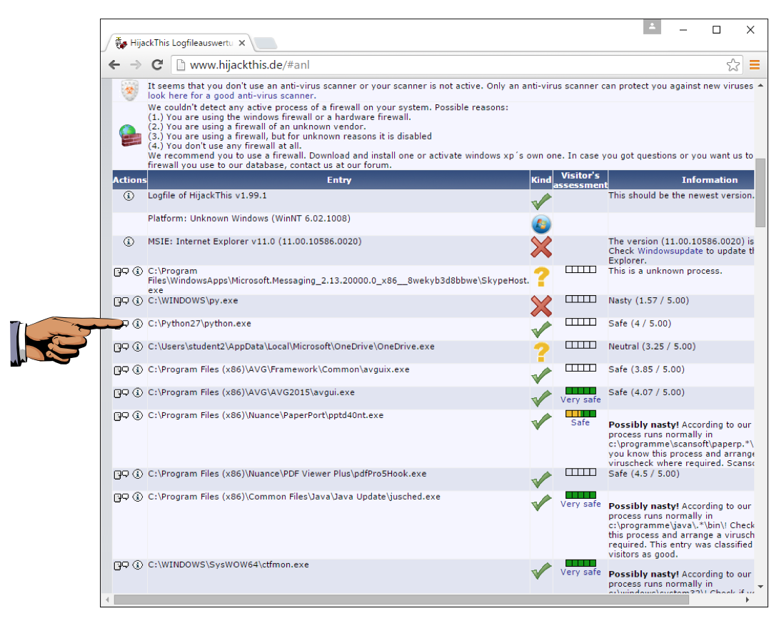 If NoScript is running, you may see a "Scripts Partially Allowed" message at the bottom of the Browser window. In that case, click the Options button and then click "Allow hijackthis.de".