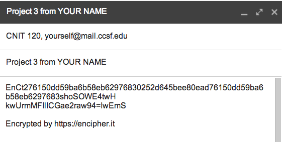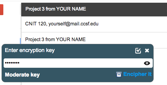 A box pops up asking for an Encryption Key. Enter CNIT 120 (don't forget the space after CNIT) and click the "Encipher It" button.