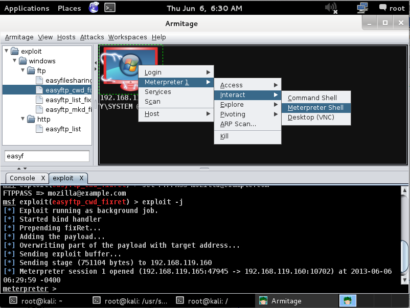 In Armitage, right-click the target and click "Meterpreter 1", Interact, "Meterpreter Shell", as shown below:
