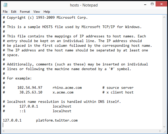 This entry will redirect platform.twitter.com to the localhost, which is not a Web server, and won't provide the Widget. As far as your machine is concerned, that Web site has vanished.