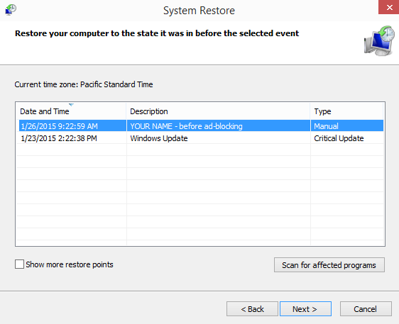 In the "Restore system files and settings" box, click the restore point with your name on it, as shown below.