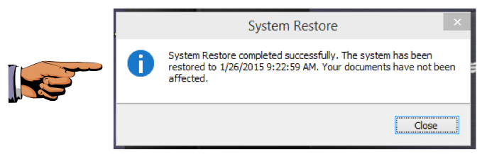 The restore completes, and your machine restarts. Log in as before. You should see a message saying "System Restore completed successfully", as shown below.