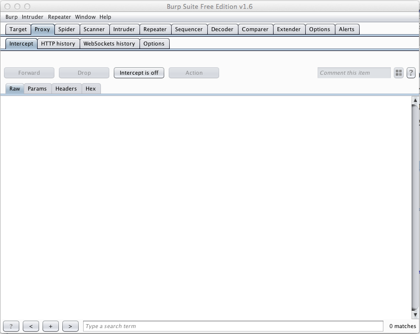 In Burp, click the Proxy tab. Click the Intercept button. Make sure the button label reads "Intercept is off", as shown below.