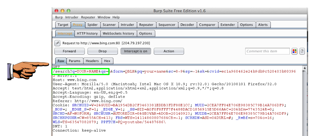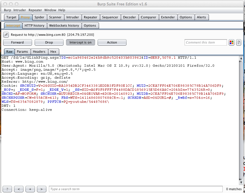 In Firefox, in the Bing page, press Enter. Burp shows the Web request, as shown below.