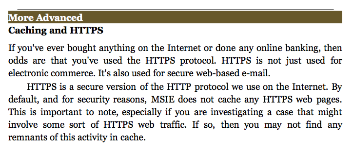 This is trivial to verify this by visiting some HTTPS pages in Internet Explorer and viewing the Temporary Internet Files.