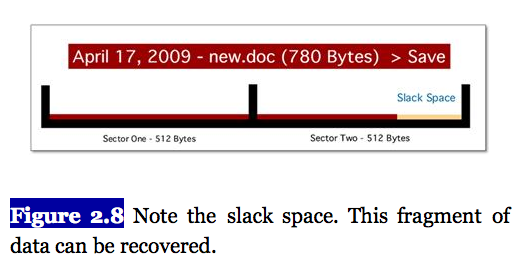 This statement is completely false. What really happens is that every write operation always writes 512 bytes. So the area marked "slack space" in the figure is overwritten by zeroes in modern operating systems.