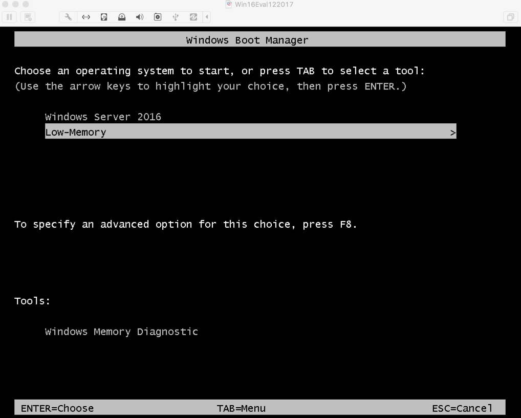 Restart the computer. A boot menu offers you two choices. Press the down-arrow key on the keyboard to select "Low-Memory", as shown below. Then press the Enter key to boot.
