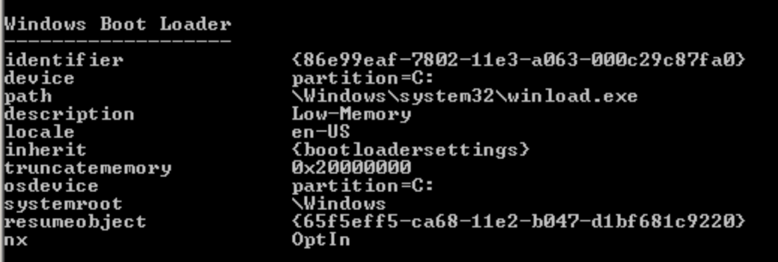 bcdedit /set {86e99eaf-7802-11e3-a063-000c29c87fa0} truncatememory 0x20000000