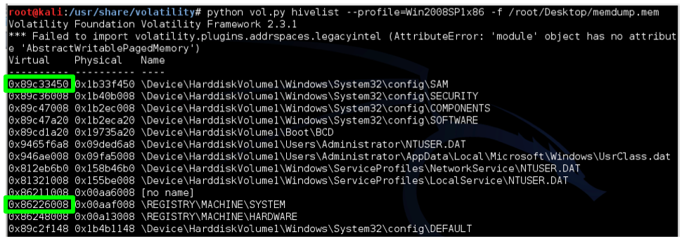 volatility hivelist --profile=Win2008SP1x86 -f memdump.mem