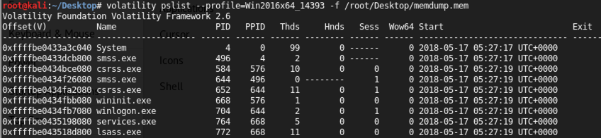 volatility pslist --profile=Win2016x64_14393 -f /root/Desktop/memdump.mem