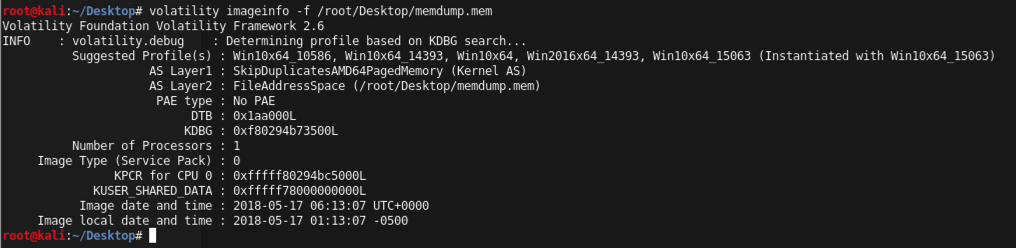 volatility imageinfo -f /root/Desktop/memdump.mem