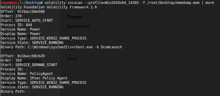 volatility svcscan --profile=Win2016x64_14393 -f /root/Desktop/memdump.mem | more