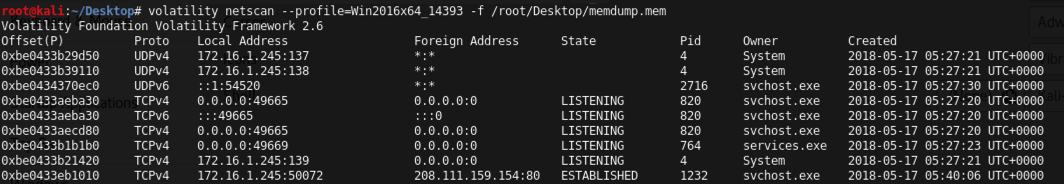 volatility netscan --profile=Win2016x64_14393 -f /root/Desktop/memdump.mem