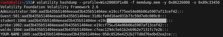 volatility hashdump --profile=Win2008SP1x86 -f memdump.mem -y 0x86226008 -s 0x89c33450